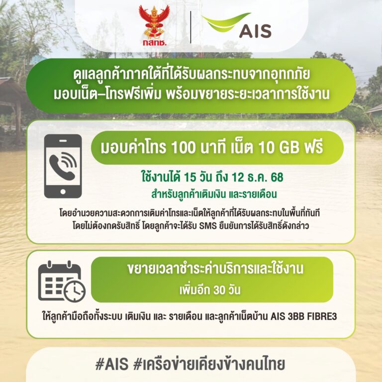 เอไอเอส ร่วมกับ กสทช. ดูแลลูกค้าภาคใต้ที่ได้รับผลกระทบจากอุทกภัย มอบเน็ต–โทรฟรีเพิ่ม พร้อมขยายระยะเวลาการใช้งาน เพื่ออำนวยความสะดวกการติดต่อสื่อสารในช่วงวิกฤต