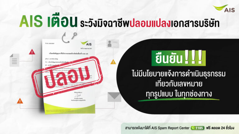 AIS เตือนระวังมิจฉาชีพปลอมแปลงเอกสารบริษัท ยืนยัน!!! ไม่มีนโยบายแจ้งการดำเนินธุรกรรมเกี่ยวกับเลขหมายทุกรูปแบบ ในทุกช่องทาง