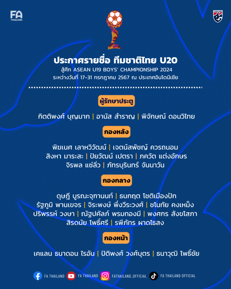ประกาศ : รายชื่อ 23 แข้ง ทีมชาติไทย U20 ลุยศึก AFF ที่ อินโดนีเซีย