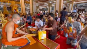 คนขอนแก่นทำบุญเนื่องในวันพระใหญ่แน่นวัด ขณะที่พระภิกษุสงฆ์นำข้าวสาร-อาหารแห้ง จากญาติโยมที่นำมาถวาย