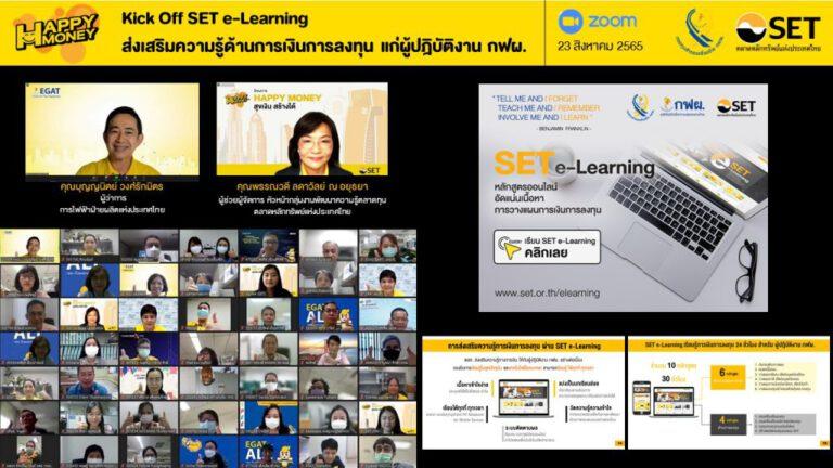 บุญญนิตย์ วงศ์รักมิตร ผู้ว่าการการไฟฟ้าฝ่ายผลิตแห่งประเทศไทย และพรรณวดี ลดาวัลย์ ณ อยุธยา ผู้ช่วยผู้จัดการ ตลาดหลักทรัพย์แห่งประเทศไทย ร่วมเปิดตัวโครงการส่งเสริมความรู้ด้านการวางแผนการเงินการลงทุนด้วย SET e-Learning สนับสนุนให้ผู้ปฎิบัติงาน กฟผ. มีองค์ความรู้สามารถนำไปปรับใช้เพื่อสร้างความมั่นคงทางการเงินได้ เมื่อ 23 ส.ค. ที่ผ่านมา โดยมีผู้สนใจร่วมโครงการกว่า 500 คน ทั้งนี้ ผู้อบรมสามารถเรียนรู้ผ่