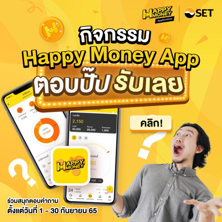ตลาดหลักทรัพย์แห่งประเทศไทย ชวนผู้สนใจร่วมกิจกรรม “Happy Money App ตอบปั๊ป รับเลย” ตลอดเดือนกันยายนนี้ ร่วมสนุกตอบคำถามใน Happy Money App ลุ้นรางวัลมากมาย โดยผู้ร่วมกิจกรรมต้องดาวน์โหลด Happy Money App และ Login ด้วย SET Member แล้วตอบคำถามประจำวันต่อเนื่อง 30 วัน ตั้งแต่วันที่ 1-30 กันยายน 2565 ยิ่งตอบทุกวัน ยิ่งได้ลุ้นรางวัลเพิ่ม ดูรายละเอียดกติกาได้ที่ Happy Money App ดาวน์โหลดฟรี! ทั้งจาก App