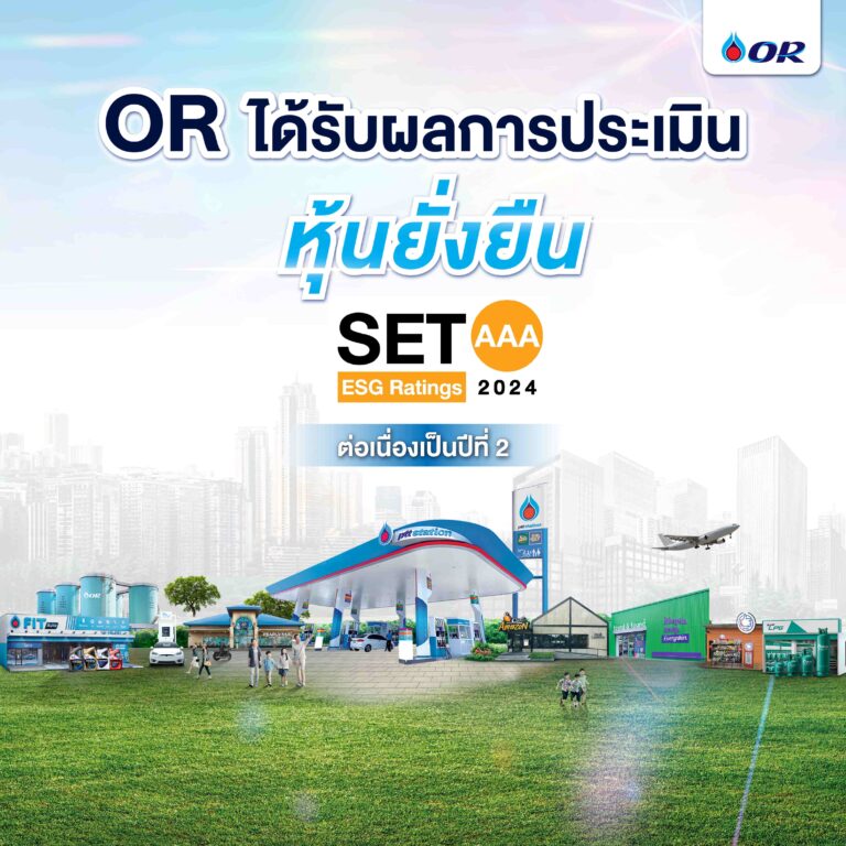 OR ได้รับการประเมินผลหุ้นยั่งยืน SET ESG Ratings ประจำปี 2567 ติดอันดับรายชื่อหุ้นยั่งยืนที่ระดับสูงสุด “AAA” ต่อเนื่องเป็นปีที่ 2 ตอกย้ำความมุ่งมั่นในการดำเนินธุรกิจเพื่อการเติบโตอย่างยั่งยืน