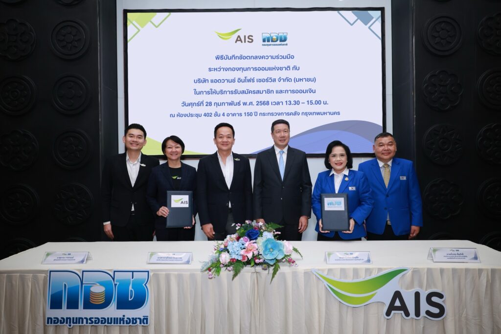 เมื่อวันที่ 28 ก.พ. ที่อาคาร 150 ปี กระทรวงการคลัง มีการจัดพิธีลงนามบันทึกข้อตกลงความร่วมมือ (MOU) การให้บริการหน่วยรับสมัครสมาชิก และช่องทางการชำระเงิน ระหว่างกองทุนการออมแห่งชาติ (กอช.) กับ บริษัท แอดวานซ์ อินโฟร์ เซอร์วิส จำกัด (มหาชน) สำหรับความร่วมมือนี้เป็นการนำศักยภาพโครงข่ายดิจิทัลอัจฉริยะสนับสนุนการเข้าถึงบริการทางการเงิน ผ่านแอปพลิเคชัน myAIS เพื่อให้ประชาชนผู้ใช้บริการจากเครือข่ายเอไอเอสที่ประกอบอาชีพอิสระ สามารถเข้าถึงนวัตกรรมทางการเงินได้อย่างทั่วถึงและสะดวกยิ่งขึ้น เพื่อเสริมสร้างสุขภาพทางการเงินที่มั่นคงและคุณภาพชีวิตที่ดีในวัยเกษียณให้กับคนไทย ในงานได้รับเกียรติจาก นายธีรลักษ์ แสงสนิท รองปลัดกระทรวงการคลัง ปฏิบัติหน้าที่ประธานกรรมการกองทุนการออมแห่งชาติ เป็นประธานในพิธี