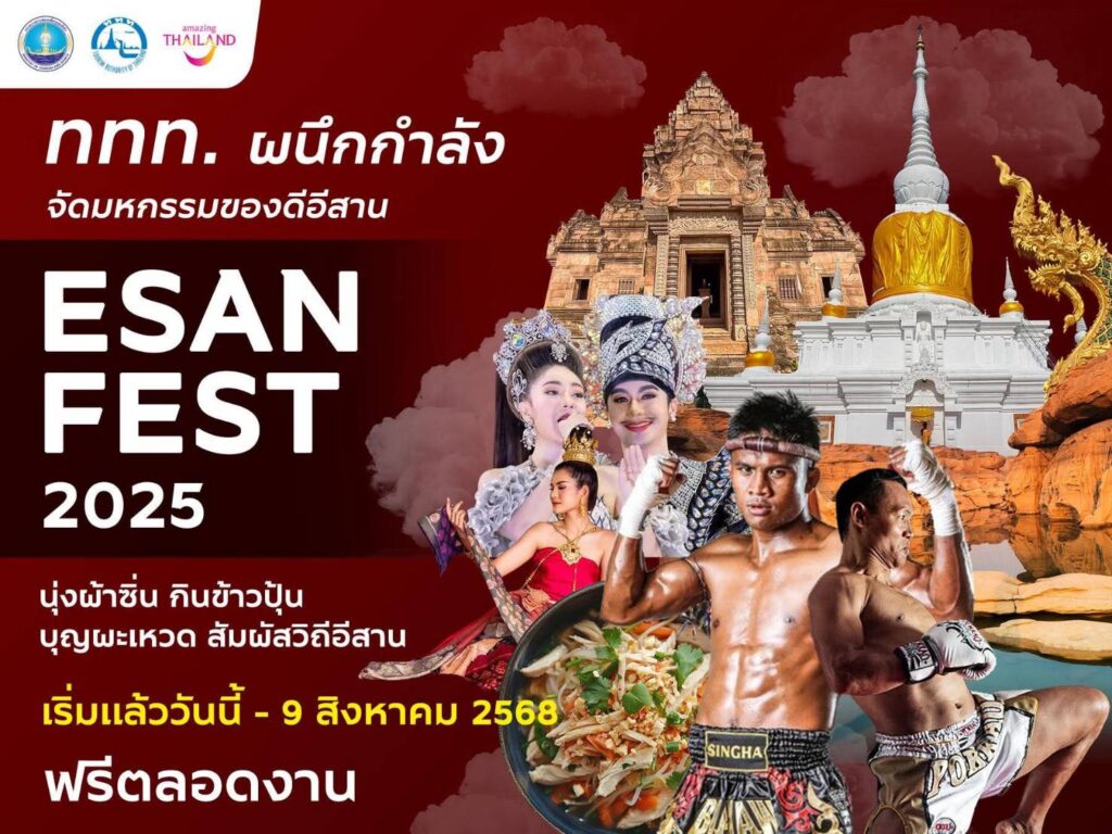 การท่องเที่ยวแห่งประเทศไทย (ททท.) โดย น.ส.ฐาปนีย์ เกียรติไพบูลย์ ผู้ว่าการ ททท. ผนึกกำลังกับจังหวัดมหาสารคาม การกีฬาแห่งประเทศไทย (กกท.) หน่วยงานภาครัฐ และสมาคมกีฬามวยไทย จัดงาน “Esan Fest” 3 วันเต็ม! ชม ชิม ช้อป วิถีอีสาน ระหว่างวันที่ 7-9 สิงหาคม 2568 ณ อาคารพลศึกษา (ม.ใหม่) มหาวิทยาลัยมหาสารคาม โดยงานนี้จะเป็นการยกระดับภาคอีสานในฐานะแหล่งท่องเที่ยวทางวัฒนธรรม ด้วยกิจกรรมที่ผสมผสานความบันเทิง ความรู้ กีฬา และวิถีชีวิตท้องถิ่น รวมถึงการเผยแพร่ซอฟต์พาวเวอร์อีสาน