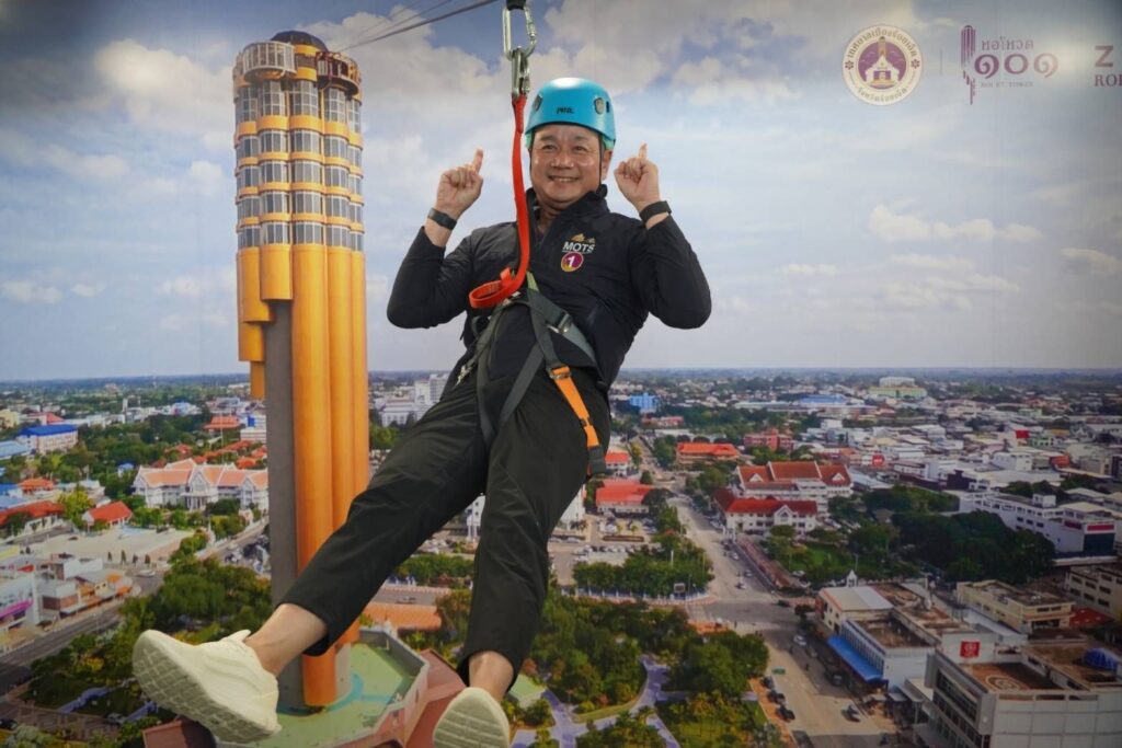 วันที่ 23 สิงหาคม 2568 เวลา 09.00 น. ณ ลานสาเกตนคร สวนสมเด็จพระศรีนครินทร์ จังหวัดร้อยเอ็ด นายสรวงค์ เทียนทอง รัฐมนตรีว่าการกระทรวงการท่องเที่ยวและกีฬา เป็นประธานในพิธีเปิดกิจกรรม Zipline หอโหวด 101 อย่างเป็นทางการ โดยมี นายชัชวาลย์ เบญจสิริวงศ์ ผู้ว่าราชการจังหวัดร้อยเอ็ด พร้อมด้วยรองผู้ว่าราชการจังหวัดร้อยเอ็ด หัวหน้าส่วนราชการ นายกเทศมนตรีเมืองร้อยเอ็ด ภาคเอกชน และประชาชน เข้าร่วมอย่างคับคั่ง กิจกรรมนี้นับเป็นอีกหนึ่งความตั้งใจของจังหวัดร้อยเอ็ดในการสร้างสรรค์แหล่งท่องเที่ยวรูปแบบใหม่ที่ผสมผสานทั้งการผจญภัยและการชมทิวทัศน์เมืองร้อยเอ็ดมุมสูงที่สวยงาม