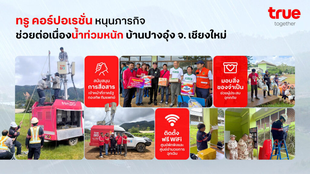 2 กันยายน 2568 – ทรู คอร์ปอเรชั่น เดินหน้าสนับสนุนภารกิจด้านการสื่อสารในสถานการณ์อุทกภัยที่ปางอุ๋ง จังหวัดเชียงใหม่ โดยติดตั้งจุดให้บริการฟรี WiFi ครอบคลุมทั้งศูนย์พักพิงชั่วคราว อบต.แม่ศึก โรงเรียนปางอุ๋ง และ ศูนย์อำนวยการฉุกเฉินช่วยเหลือผู้ประสบอุทกภัย อำเภอแม่แจ่ม จ.เชียงใหม่ เปิดให้บริการตลอด 24 ชั่วโมง รองรับการใช้งานทุกเครือข่ายมือถือฟรี เพื่อให้ประชาชนที่อพยพเข้ามาพักพิงมากกว่า 130 คน รวมถึงเจ้าหน้าที่ แพทย์ และพยาบาลสามารถติดต่อสื่อสารได้อย่างสะดวกและต่อเนื่อง พร้อมทั้งส่งมอบสิ่งของจำเป็นและอาหารแห้งเพื่อบรรเทาความเดือดร้อนแก่ผู้ประสบภัยในศูนย์พักพิง