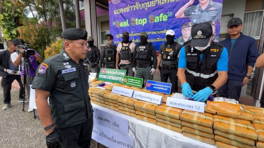 เมื่อเวลา 11.30 น.วันที่ 11 ก.ย.2568 ที่หน้ากองบังคับการตำรวจตระเวนชายแดนภาค 2 พ.ต.อ.คณิต กลิ่นศรีสุข รอง ผบก.ตชด.ภาค 2 พร้อมด้วย ร.ต.อ.คมสัน นิลสมบูรณ์ หน.ชปข.บก.ตชด.ภาค 2 พร้อมเจ้าหน้าที่ชุดจับกุมได้ร่วมกันแถลงข่าวผลการตรวจยึดยาเสพพร้อมของกลาง ยาบ้า 1,600,000 เม็ด รวมมูลค่ากว่า 50 ล้านบาท ,อาวุธปืนแบล็งกันดัดแปลง จำนวน 1 กระบอก พร้อมกระสุนปืนขนาด .380 จำนวน 3 นัด และรถยนต์ มิตซูบิชิ แอสทราจ สีดำ ซึ่งถูกสวมทะเบียนหมายเลข กน- 3649 อุดรธานี 1 คัน