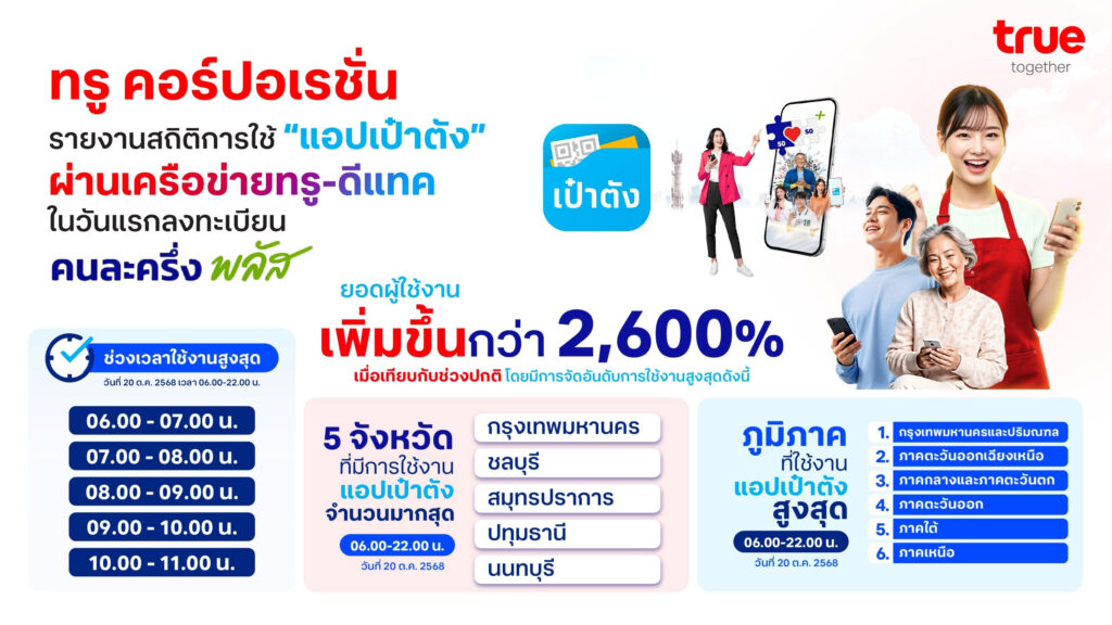 21 ตุลาคม 2568 – ทรู คอร์ปอเรชั่น รายงานข้อมูลสถิติการใช้งานแอปพลิเคชัน “เป๋าตัง” ของลูกค้าทรูและดีแทคในวันแรกของการลงทะเบียนโครงการ “คนละครึ่งพลัส” (ระหว่างเวลา 06.00–22.00 น.) พบว่าปริมาณผู้ใช้งานเพิ่มขึ้นมากกว่า 2,600% เมื่อเทียบกับช่วงเวลาปกติ สะท้อนกระแสตอบรับอย่างล้นหลามจากประชาชนทั่วประเทศที่เข้าร่วมลงทะเบียนพร้อมกันในวันแรก พร้อมจัดตั้งวอร์รูม (Warroom) ที่ BIC ศูนย์ปฏิบัติการเครือข่ายอัจฉริยะ พร้อม AI เพื่อดูแลและบริหารเครือข่ายตลอด 24 ชั่วโมงเพื่อให้ลูกค้าทรูและดีแทคมั่นใจได้เต็มที่
