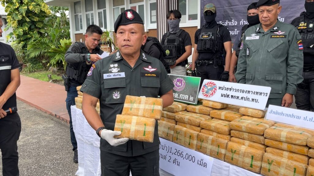 เมื่อเวลา 16.00 น.วันที่ 27ต.ค.2568 ที่ บก.ตชด.ภ.2 พ.ต.อ.คณิต กลิ่นศรีสุข รอง ผบก.ตชด.ภ.2 พร้อมกำลังเจ้าหน้าที่ตำรวจ ตชด. ร่วมกันแถลงข่าวผลการจับกุมนายทัศนะ สีสด อายุ 38 ปี ชาว อ.โนนนารานณ์ จ.สุรินทร์ และนายพรชัย สดใส อายุ 28 ปี ชาว อ.อุทุมพรพิสัย จ.ศรีสะเกษ พร้อมของกลาง ยาบ้า 1,266,000เม็ด รถยนต์เก๋งโตโยต้าอัลติสสีทองหมายเลขทะเบียน ญก-2064 กรุงเทพฯและรถเก๋ง โตโยต้า ยาลิส สีเทา หมายเลขทะเบียน ขม- 6465 ระยอง หลังถูกเจ้าหน้าที่ตำรวจ ชุดปฎิบัติการข่าว บก.ตชด.ภ.2 จับกุมตัวได้ขณะขับรถผ่านจุดตรวจบนสะพานเทพสุดา อ.หนองกุงศรี จ.กาฬสินธุ์