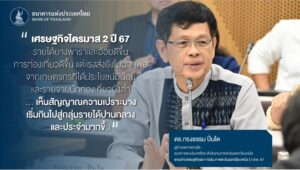 ภาพรวมเศรษฐกิจไทยปี 2568และ 2569คาดว่าขยายตัวต่ำเพียง 2.1% และ 1.6% เศรษฐกิจที่โตต่ำเกิดจากปัญหาเชิงโครงสร้าง เช่น ขีดความสามารถในการแข่งขันลดลงและสังคมสูงวัย เป็นต้นภาคอีสานเองที่พึ่งพาภาคเกษตรสูงก็เผชิญปัญหาผลิตภาพต่ำและปีนี้ราคาสินค้าเกษตรไม่ดี ยิ่งซ้ำเติมปัญหารายได้ไม่พอรายจ่ายโดยในช่วงปี 2560-66 รายได้ครัวเรือนอีสาน โตเฉลี่ย 0.5% ต่อปี แต่รายจ่ายโตเฉลี่ยถึง2% ทำให้เกิดปัญหาหนี้เพิ่มขึ้น หนี้ครัวเรือนอีสานโตขึ้นกว่า 55% ในขณะที่ประเทศโต 24% จึงต้องเร่งให้ความช่วยเหลือในการแก้หนี้