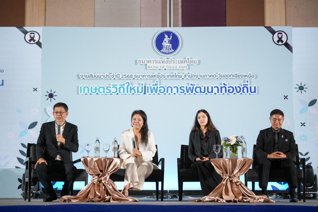 ธ.ก.ส. ซึ่งดำเนินรายการโดย ดร.ทรงธรรม ปิ่นโต ผู้อำนวยการอาวุโส ธนาคารแห่งประเทศไทย สำนักงานภาคตะวันออกเฉียงเหนือ โดยมีประเด็นหลักจากการเสวนาดังนี้ (1) จุดเริ่มต้น: ทำไมคนส่วนใหญ่ยังไม่กล้าปรับตัว แม้เกษตรกรจำนวนมากจะเห็นโอกาสจากการทำเกษตรรูปแบบใหม่ที่เป็นธุรกิจได้จริง แต่หลายคนยังไม่กล้าปรับตัวเพราะกลัวความเสี่ยง กลัวล้มเหลว และไม่รู้จะเริ่มจากตรงไหน ความไม่มั่นใจจากประสบการณ์เดิมและทักษะใหม่ที่ต้องเรียนรู้ ทำให้แม้เห็นโอกาสก็ยังไม่กล้า (2) ทำไมบางคน “กล้าปรับ” และการเป็นเกษตรกรที่คิดแบบนักธุรกิจผู้ที่ปรับตัวสำเร็จมักเริ่มจากการทำเกษตรให้ตอบโจทย์ตลาดจริง เลือกปลูกสิ่งที่ผู้บริโภคต้องการ ไม่ยึดติดกับสิ่งที่เคยทำ การเริ่มจากศูนย์กลับเป็นข้อดี เพราะทำให้ไม่กลัว ลองได้เร็ว และเรียนรู้จากการลงมือทำจริง ขณะเดียวกันการสนับสนุนจากรัฐ โดยเฉพาะ ธ.ก.ส. ทั้งเงินทุน ความรู้ และการสร้าง Mindset ใหม่ให้คนรุ่นใหม่ ช่วยสร้างความมั่นใจว่าไม่ได้สู้คนเดียว จึงกล้าปรับตัว และมองเกษตรเป็นธุรกิจที่สร้างรายได้อย่างยั่งยืนได้จริง(3) คำแนะนำสำคัญสำหรับผู้เริ่มต้นใหม่หัวใจของเกษตรยุคใหม่คือการบริหารจัดการ ตั้งแต่ต้นทุน การตลาด การสร้างคุณค่า ไปจนถึงการใช้เทคโนโลยีช่วยเพิ่มประสิทธิภาพ การเริ่มเล็ก ๆ ทดลองจริง เรียนรู้จากประสบการณ์ตรง และมีทัศนคติที่เชื่อว่าทำได้ คือก้าวแรกที่จะทำให้การทำเกษตรพัฒนาไปเป็นธุรกิจที่มั่นคงในระยะยาว