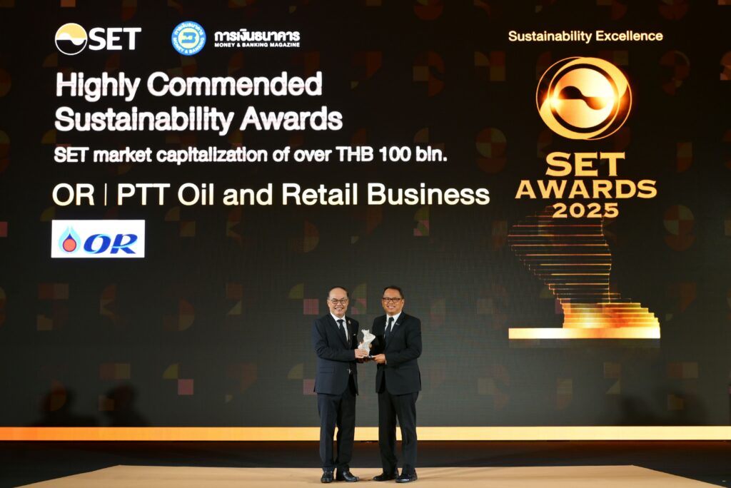 ศาสตราจารย์พิเศษ กิติพงศ์ อุรพีพัฒนพงศ์ ประธานกรรมการตลาดหลักทรัพย์แห่งประเทศไทย มอบรางวัล SET Awards ในระดับ Highly Commended Sustainability Awards ให้แก่ นายสุชาติ ระมาศ ผู้อำนวยการใหญ่ บริษัท ปตท. น้ำมันและการค้าปลีก จำกัด (มหาชน) หรือOR ในงาน SET Awards 2025 ซึ่งจัดโดยตลาดหลักทรัพย์แห่งประเทศไทย (SET) ร่วมกับวารสารการเงินธนาคาร โดยรางวัลนี้มอบให้กับบริษัทจดทะเบียนที่มีการดำเนินธุรกิจอย่างยั่งยืนโดดเด่น มีการกำกับดูแลกิจการที่คำนึงถึงผู้มีส่วนได้เสียรอบด้าน พร้อมทั้งสามารถเติบโตด้านเศรษฐกิจควบคู่ไปกับการดูแลสังคมและสิ่งแวดล้อม เพื่อให้เป็น “แบบอย่าง” ให้แก่บริษัทจดทะเบียนและองค์กรอื่น