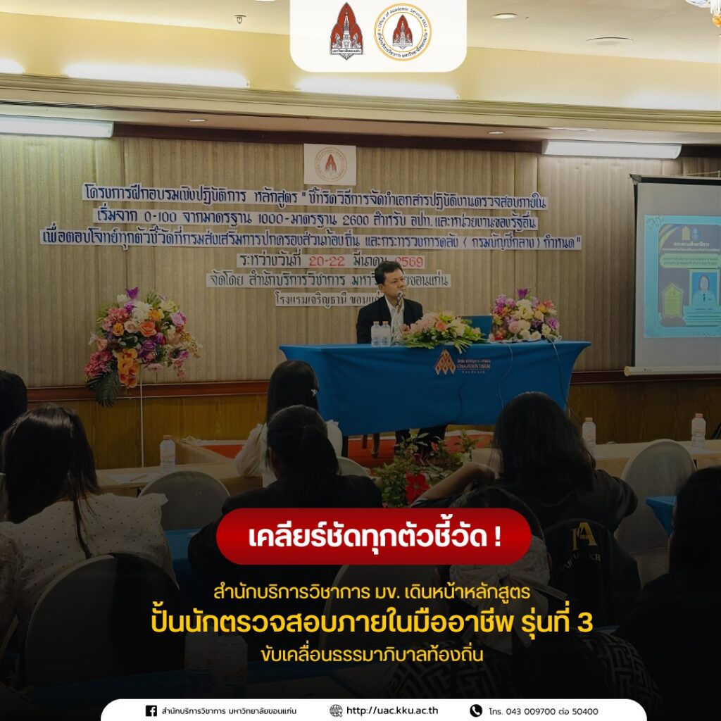 สำนักบริการวิชาการ มหาวิทยาลัยขอนแก่น (OAS KKU) เดินหน้ายกระดับมาตรฐานการทำงานหน่วยงานรัฐ จัดอบรมเชิงปฏิบัติการหลักสูตรเข้มข้น “ปั้นนักตรวจสอบภายในมืออาชีพ เริ่มต้นจาก 0-100” รุ่นที่ 3 มุ่งสร้างความเข้าใจเชิงลึกในการจัดทำเอกสารตามมาตรฐานกระทรวงการคลัง ตอบโจทย์การบริหารงานที่โปร่งใสและมีประสิทธิภาพตามเป้าหมายการพัฒนาที่ยั่งยืน (SDGs)