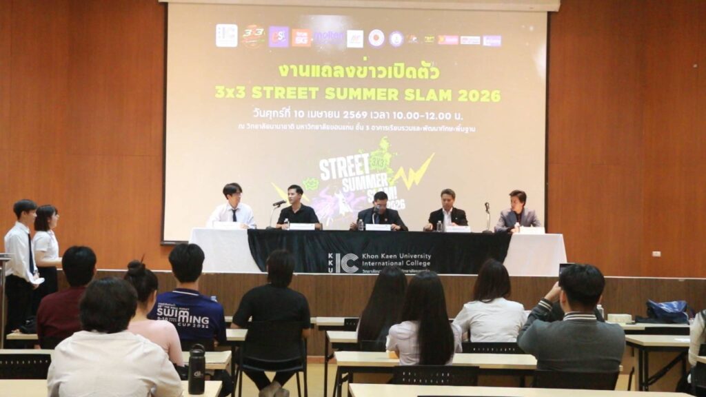 เมื่อเวลา 11.00 น.วันที่ 10 เม.ย.2569 ที่ อาคารเรียนรวมและพัฒนาทักษะพื้นฐาน วิทยาลัยนานาชาติ มหาวิทยาลัยขอนแก่น หรือ มข. ดร.ณธกร เลิศพชรกมล รองคณบดีฝ่ายการศึกษาฯวิทยาลัยนานาชาติ มข.พร้อมด้วย ดร.พัฒนพงศ์ โตภาคงาม หัวหน้าสาขาวิชาธุรกิจ นวัตกรรม และวิทยาศาสตร์ประยุกต์ วิทยาลัยนานาชาติ และนายฉลอง ภูแม่นเขียว ประธานโครงการการจัดการแข่งขันบาสเกตบอลการกุศล “ KKUIC 3×3 Street Summer Slam 2026” ซึ่งวิทยาลัยนานาชาติ มข.ร่วมกับหน่วยงานภาครัฐและเอกชนในพื้นที่กำหนดจัดการแข่งขันในช่วงระหว่างวันที่ 25-26 เม.ย. ท่ามกลางความสนใจจากนักกีฬาบาสเกตบอลและนักศึกษาฯ รวมทั้งสื่อมวลชนเข้าร่วมรับฟังเป็นจำนวนมาก