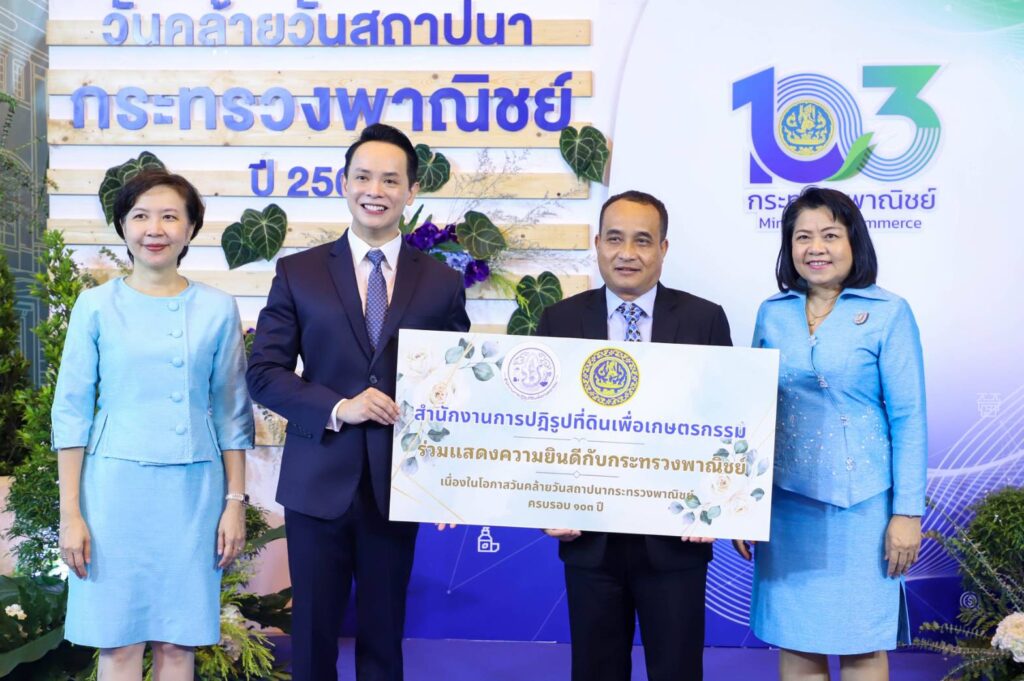 ดร.วิณะโรจน์ ทรัพย์ส่งสุข เลขาธิการสำนักงานการปฏิรูปที่ดินเพื่อเกษตรกรรม ได้ มอบหมายให้ นายสุรชัย ยุทธชนะ รองเลขาธิการสำนักงานการปฏิรูปที่ดินเพื่อเกษตรกรรม พร้อมด้วย นางสาวฆนีรส โพธิ์เจริญ ผู้อำนวยการสำนักบริหารกลาง ร่วมเป็นเกียรติแสดงความยินดีเนื่องในโอกาสวันคล้ายวันสถาปนากระทรวงพาณิชย์ ครบรอบ 103 ปี ณ อาคารสำนักงานปลัดกระทรวงพาณิชย์ ( ชั้น 3 ) ถนน นนทบุรี ตำบลบางกระสอ อำเภอ เมือง จังหวัดนนทบุรี เมื่อวันที่ 18 สิงหาคม 2566