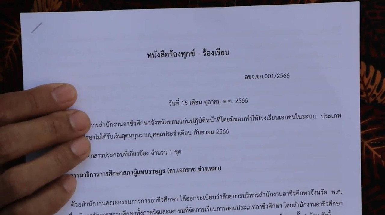 แต่ในเดือน ก.ย. 2566 ซึ่งอยู่ในไตรมาสสุดท้ายของปี ทุกโรงเรียนยังไม่ได้รับเงินอุดหนุน ทั้งที่มีการตรวจผ่านไปแล้ว ซึ่งทราบว่ามี 12 โรงเรียนที่ผ่านตามระเบียบส่วนที่เหลือจะมีการตรวจรอบที่ 2 แต่ก็ไม่เข้าใจว่า ทำไมผู้อำนวยการสำนักงานอาชีวศึกษาจังหวัดขอนแก่น ไม่อนุมัติจ่ายเงินอุดหนุนให้โรงเรียนที่ผ่านมาตาฐานแล้ว แต่กลับเหมารวมไม่จ่ายทั้งจังหวัด รวม 19 แห่ง และเป็นเพียงจังหวัดเดียวเท่านั้นที่ไม่ได้รับเงินอุดหนุน จึงเห็นว่าไม่มีความเป็นธรรมกับโรงเรียนทั้ง 19 แห่ง เพราะเงินอุดหนุนนั้นเป็นเงินภาษีของประชาชนที่รัฐบาลจัดสรรมาอุดหนุนโรงเรียนให้จัดการศึกษาให้นักเรียนที่ต้องการเรียนหนังสือ โรงเรียนบางแห่งไม่มีเงินจ่ายเงินเดือนครู ไม่มีเงินจ่ายค่าน้ำค่าไฟ ทุกอย่างเกิดปัญหาโดยรวมทั้งหมด จึงได้รวมตัวกันร้องเรียนกับ กรรมาธิการการศึกษาสภาผู้แทนราษฎร เพื่อนำเรื่องเสนอต่อคณะกรรมการการศึกษาสภาผู้แทนราษฎรและรัฐมนตรีว่าการกระทรวงศึกษาธิการ ให้พิจารณาการปฏิบัติหน้าที่ของผู้อำนวยการสำนักงานอาชีวศึกษาจังหวัดขอนแก่นว่าเหมาะสมหรือไม่ เพื่อแก้ไขปัญหาให้โรงเรียนเอกชนในระบบทั้ง 19 แห่งโดยด่วน”