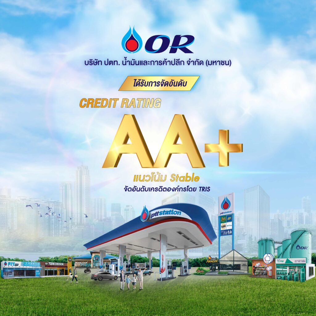 OR ตอกย้ำความเป็นผู้นำในธุรกิจค้าปลีกน้ำมันประเทศไทย โดยได้รับการจัดอันดับเครดิตองค์กร (Company Rating) ที่ระดับ “AA+” จากทริสเรทติ้ง (TRIS) ด้วยแนวโน้มอันดับเครดิตคงที่ (Stable) ต่อเนื่องเป็นปีที่ 2 สะท้อนความสำเร็จด้วยผลการดำเนินงานที่โดดเด่น และฐานะทางการเงินที่แข็งแกร่ง