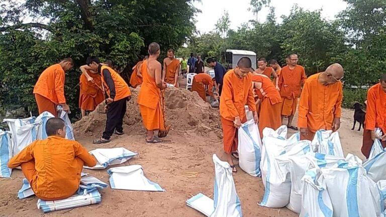 คุณพระช่วย พระวัดดังขอนแก่น ผนึกพลังร่วมชุมชน กรอกกระสอบทรายปิดประตูระบายน้ำรับมือน้ำท่วมเขตเมืองเต็ม