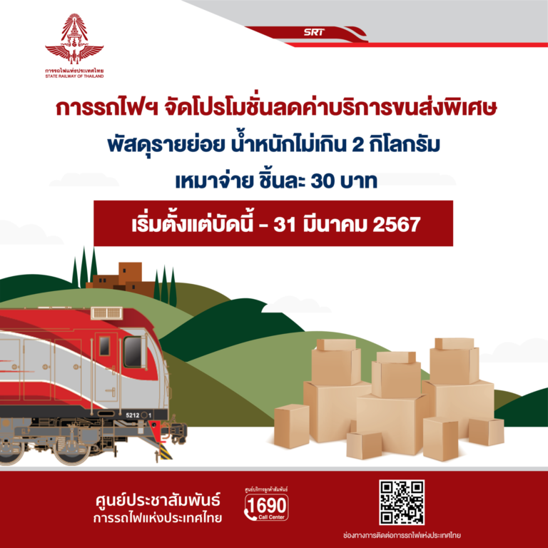 เผย การรถไฟฯ จัดโปรโมชั่นลดค่าบริการขนส่งพิเศษ พัสดุรายย่อยไม่เกิน 2 กก. เหมาจ่าย ชิ้นละ 30 บาท ช่วยลดค่าครองชีพ ถึง 31 มีนาคม 67