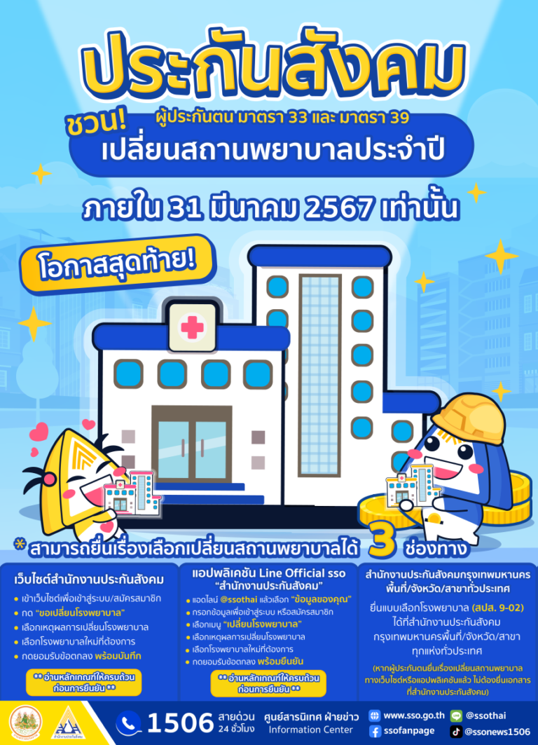 ประกันสังคม ชวน ! ผู้ประกันตนเปลี่ยน รพ. ภายใน 31 มี.ค.นี้ เท่านั้น